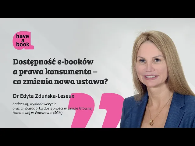 Graphic promoting an interview. On the right is a portrait of Dr Edyta Zduńska-Leseux. On the left is the Polish title “Dostępność e-booków a prawa konsumenta – co zmienia nowa ustawa?” (Ebook Accessibility and Consumer Rights – What Does the New Law Change?) along with the Have a Book logo.